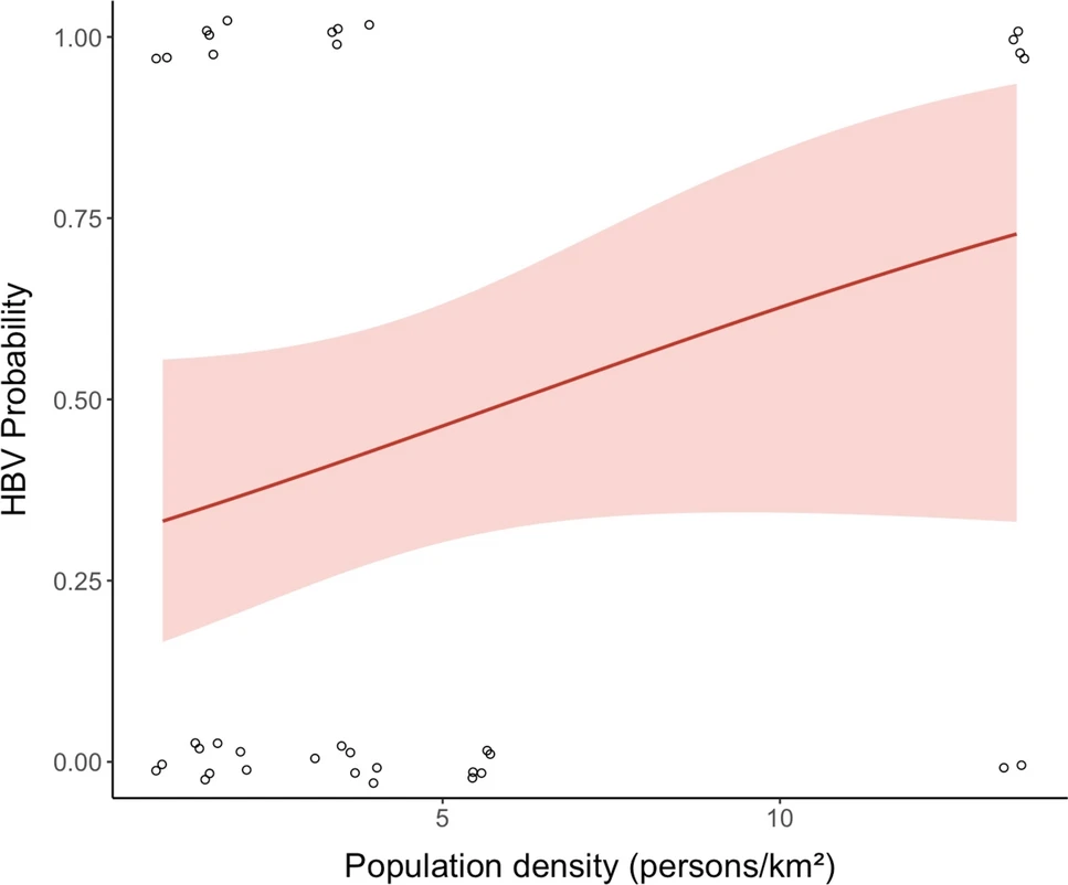 The findings suggest that human population density significantly predicts human HBV infection in wild primates, supporting the hypothesis of human-to-primate disease spillover that is driven by deforestation and encroachment (Figure 1)